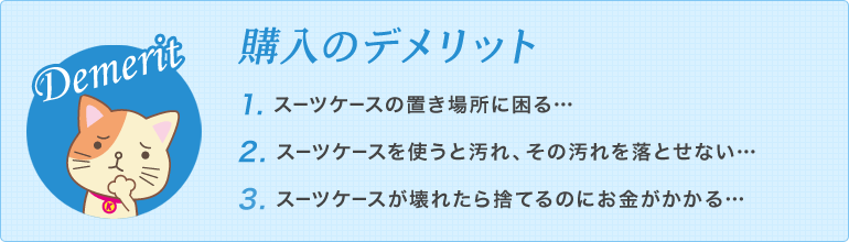 現在、素材や形状など工夫を凝らしたスーツケースが発売されていますが、必ずどこかのパーツが破損しやすい構造になっていて、破損するとその修理費は異常に高額で、場合によっては新しいスーツケースが購入できるくらい高額です。 購入のメリットとデメリットを考えた場合、最大のメリットはお気に入りのスーツケースを使用できること、デメリットは相応のコストがかることです。購入のメリットは小さく、デメリットが大きい上に購入費用やパーツ交換費用も高額で、思っているほど長く使い続けることはできません。